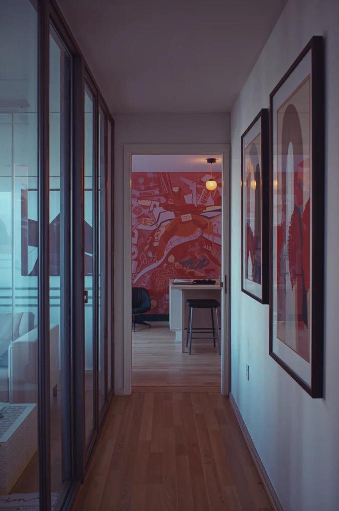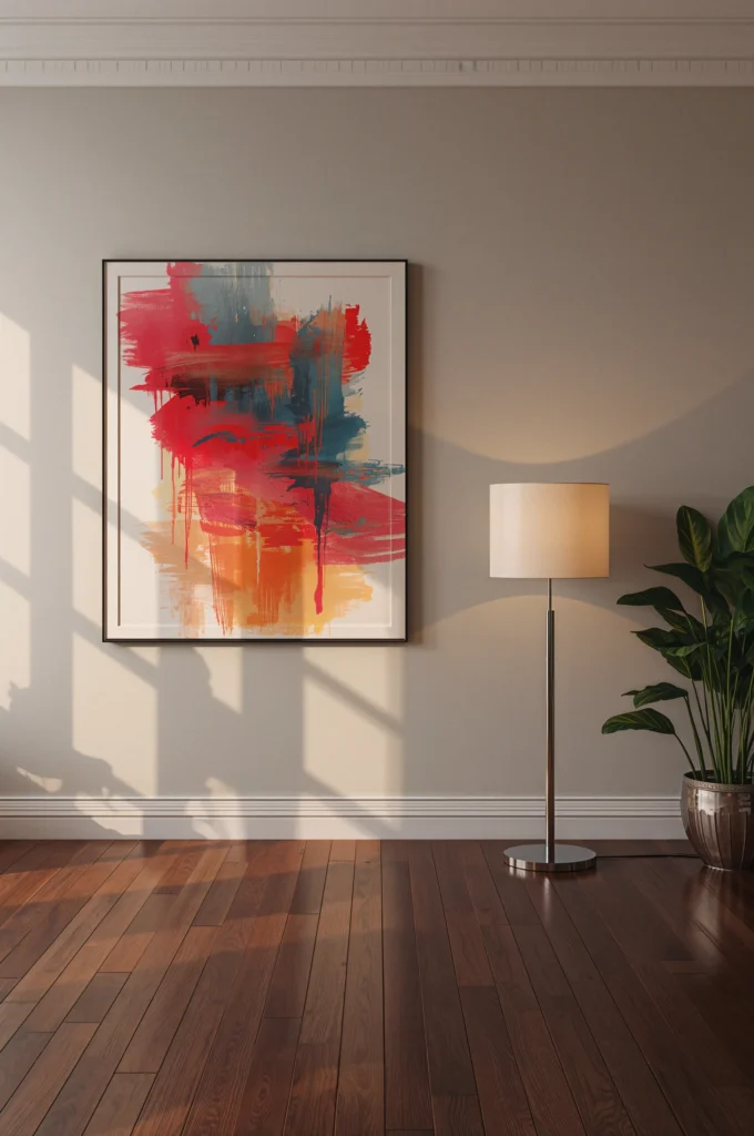 Position tall framed art pieces high on walls to draw the eye upward and emphasize room height.