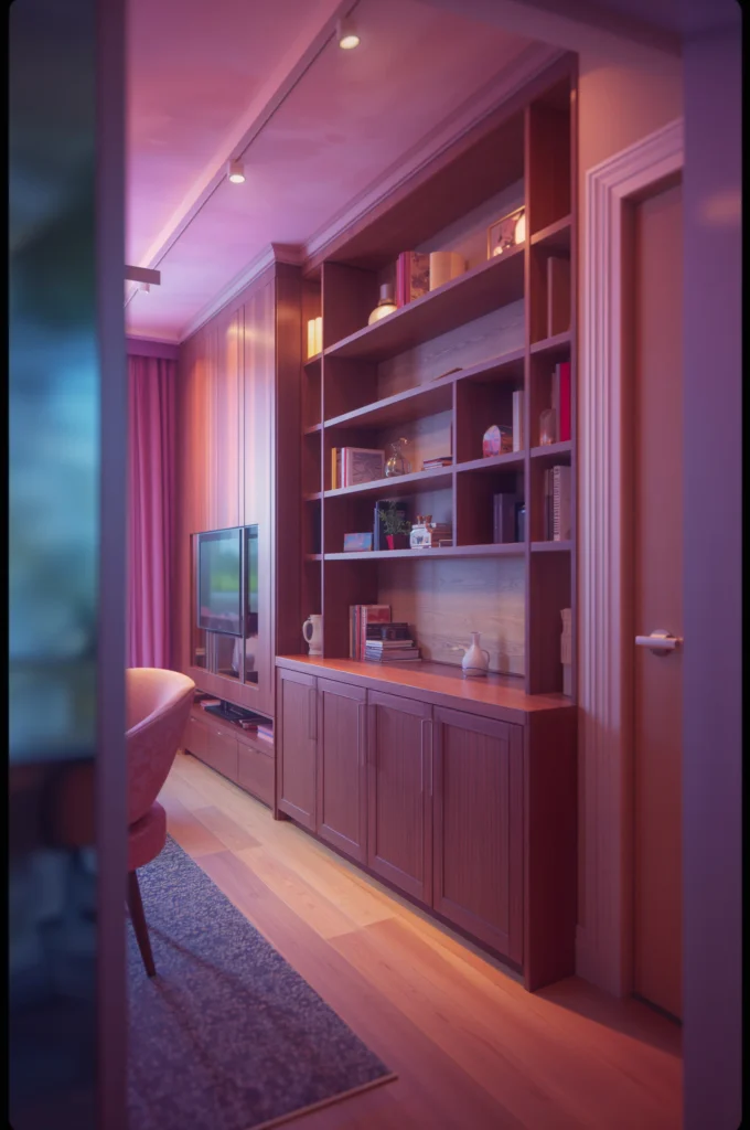 Tailored shelves and cabinets maximize small apartment dimensions for seamless storage solutions.