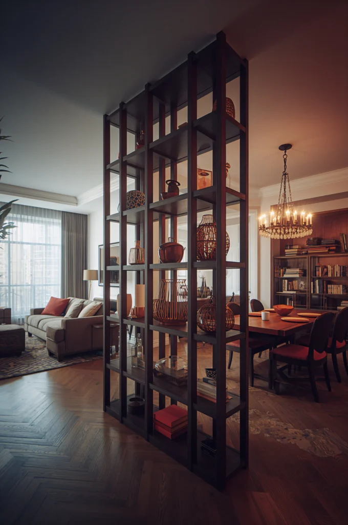 Shelved or translucent dividers can create zones without closing off a small apartment’s openness.