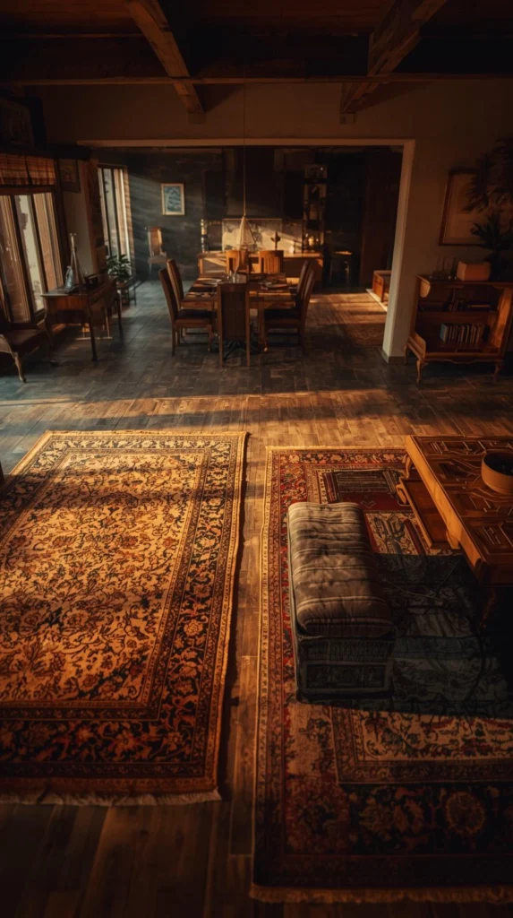 Use rugs to visually separate the living room from dining or kitchen spaces, adding comfort and structure without physical barriers.
