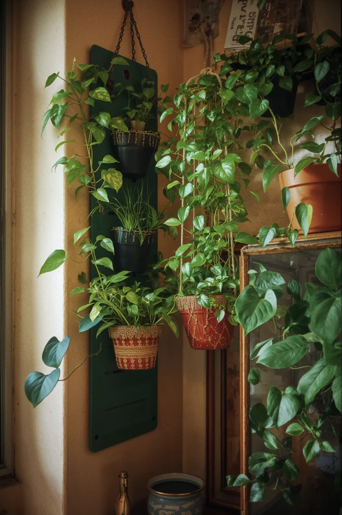 Incorporate small green plants using vertical planters or hanging pots to introduce life and freshness without taking up floor space.