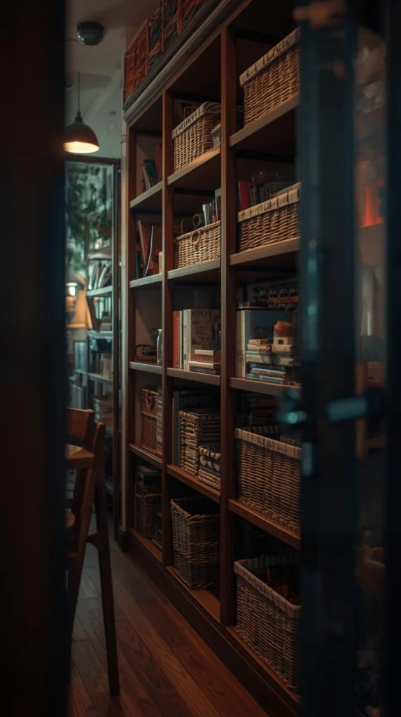 Open shelving paired with baskets provides organized storage while keeping clutter hidden and the room feeling spacious.