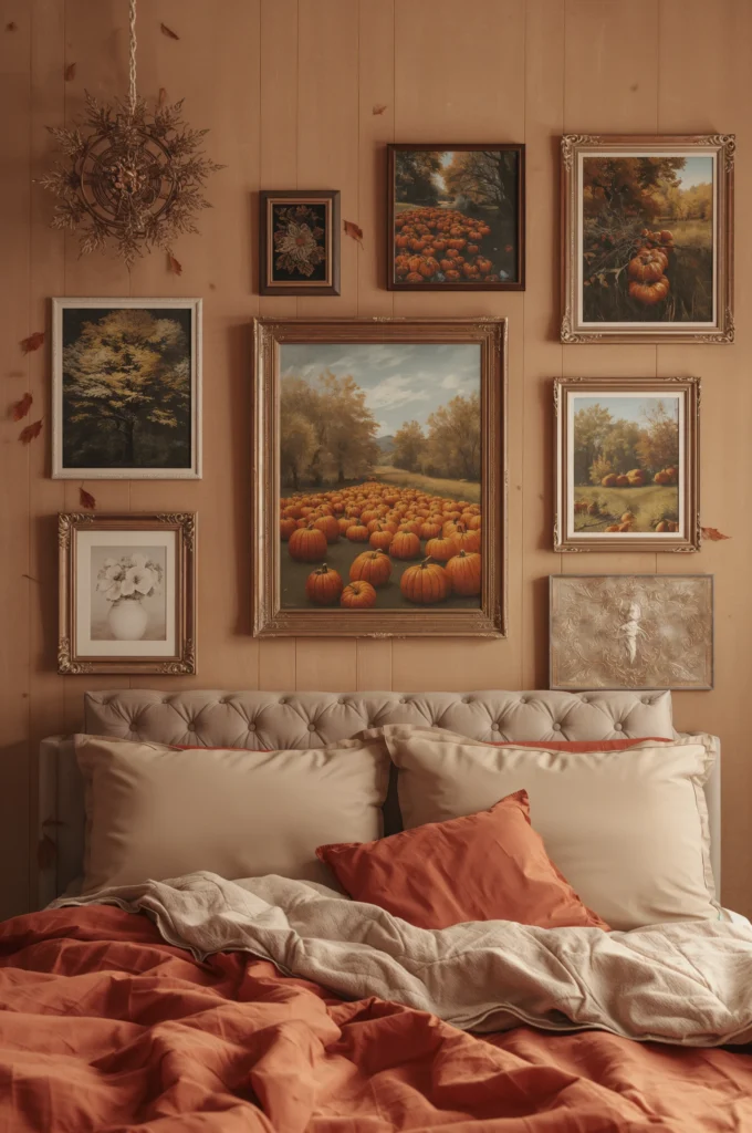 Hang prints or paintings that reflect fall themes—golden forests, pumpkin patches, or abstract autumn landscapes.