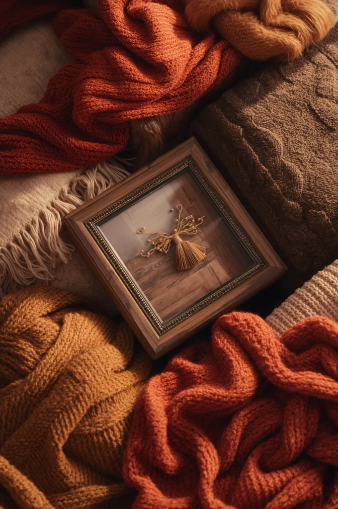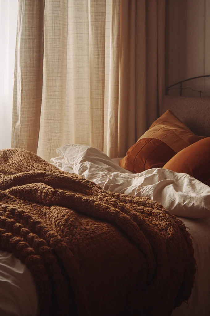 Bring instant warmth by layering your bed with chunky knit throws, soft flannel sheets, and velvet pillow covers. Mixing textures creates a tactile and visual comfort zone.