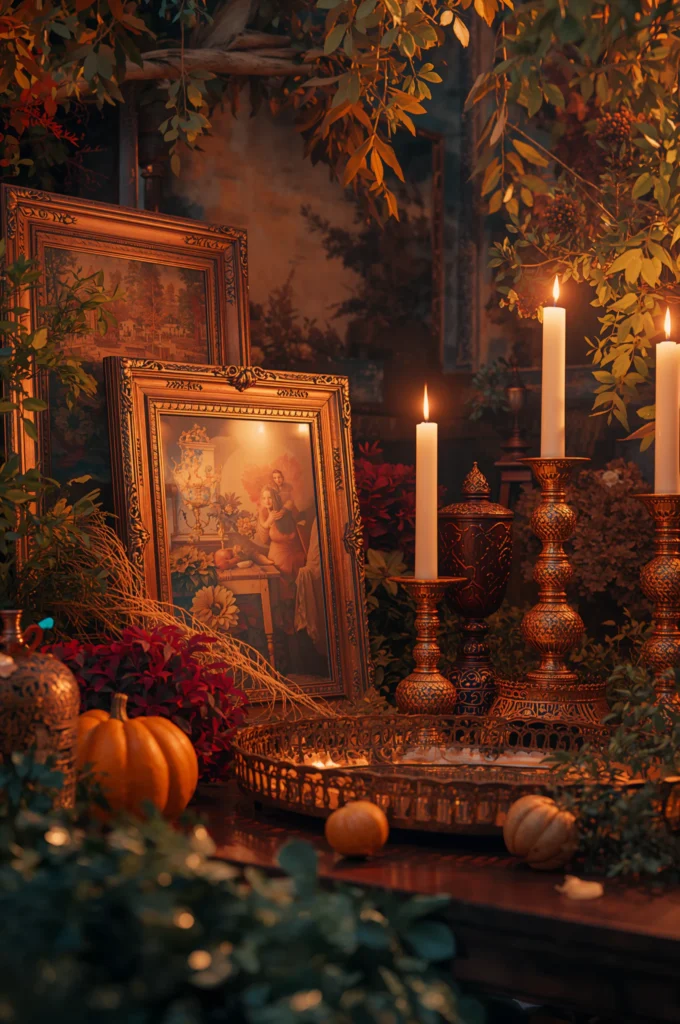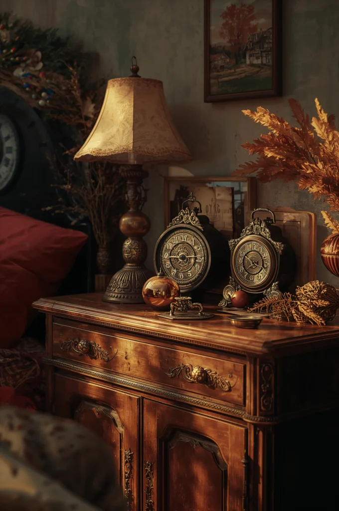 Incorporate vintage clocks, mirrors, or lamps with warm bronze or rust finishes for nostalgic autumn charm.