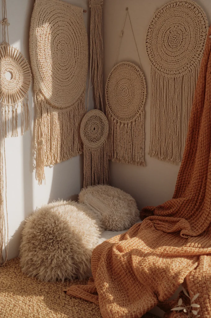 Mix woven wall hangings or macrame with warm tones and knits to add cozy textures to bare walls.