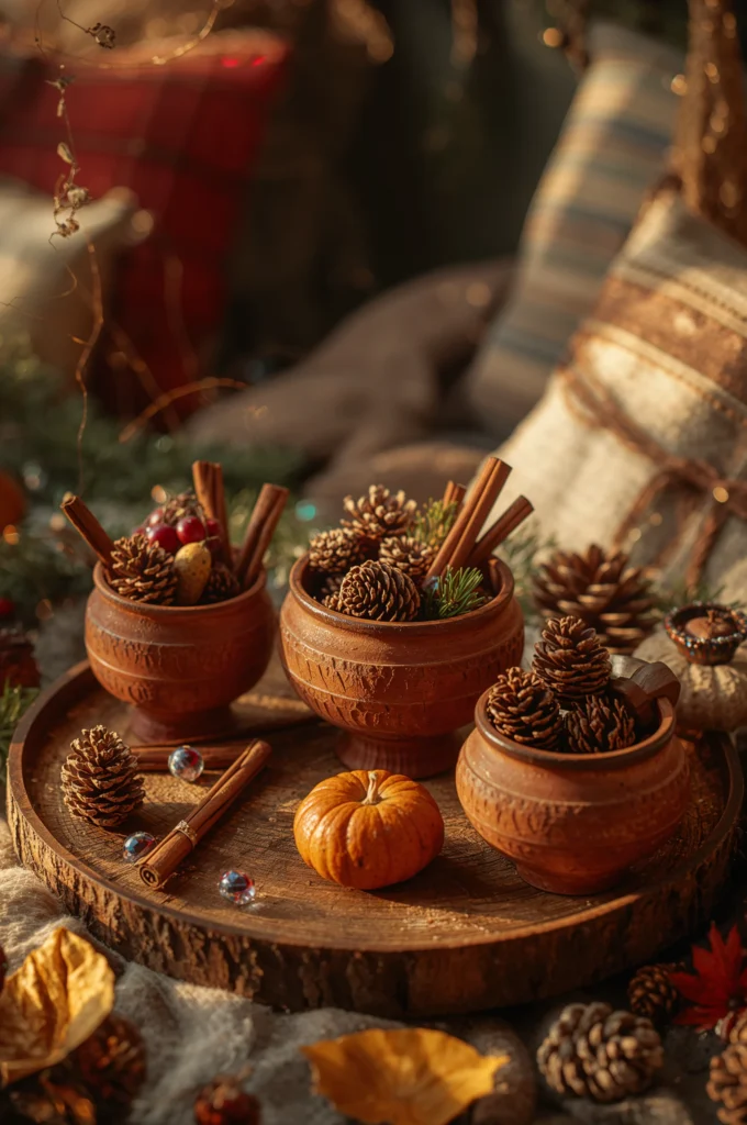 Place ceramic or wooden bowls filled with pinecones, cinnamon sticks, or dried fruit as functional and decorative accents.