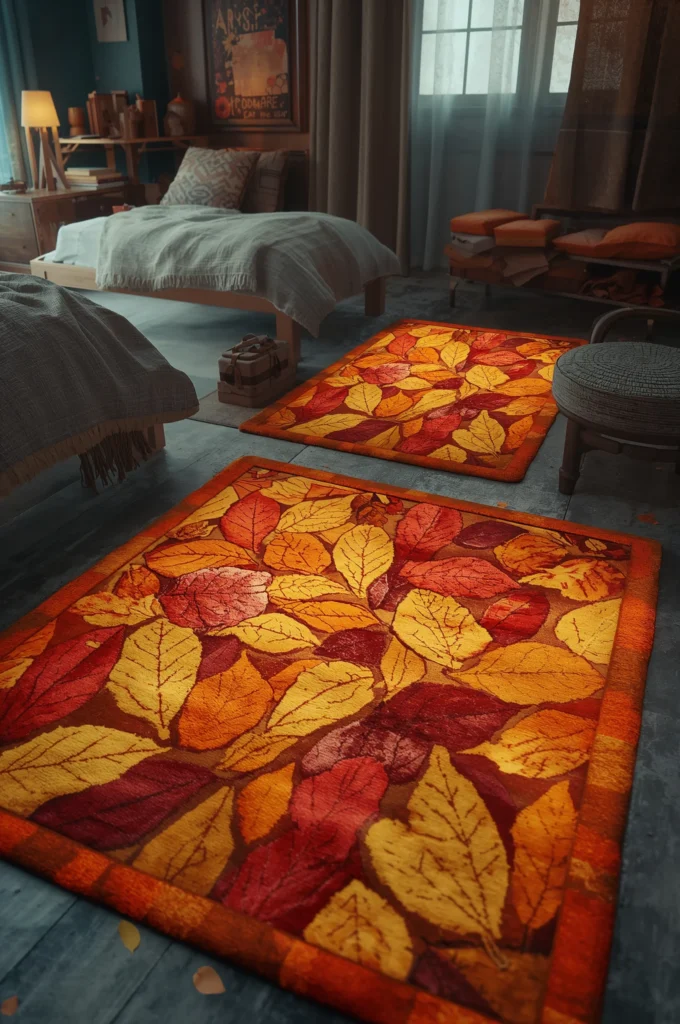 Swap out your usual patterns for rugs featuring leaves, branches, or geometric fall-inspired motifs for a subtle seasonal update.