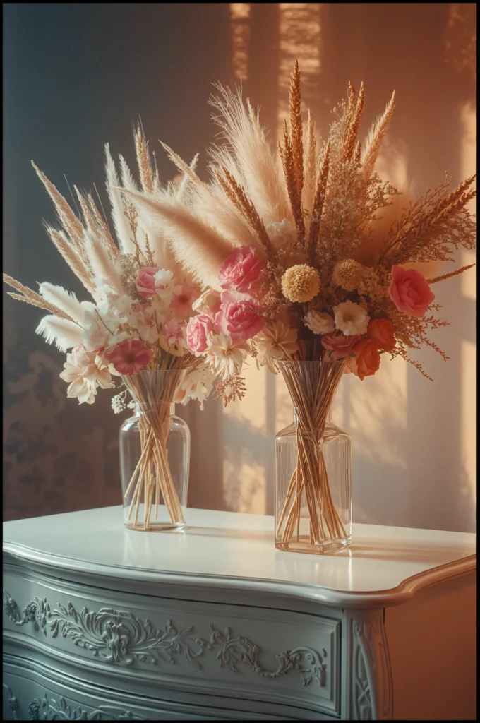 Decorate side tables with dried flowers, pampas grass, or branches in vases complementing your color scheme.
