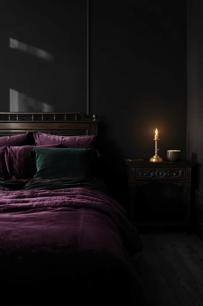 Dark colors are the foundation of a witchy bedroom. Shades like black, plum, deep green, and midnight blue create a rich backdrop that feels both grounding and powerful. These tones work well on walls, bedding, or accent furniture. You don’t need to cover everything; an accent wall or dark curtains can transform the energy of a space. Pair darker tones with metallic accents like silver, brass, or gold to create balance and avoid a dull or heavy look. Soft lighting enhances the mood by casting warm shadows across the room. Velvet and linen fabrics work perfectly in this setting. The darker palette makes other witchy elements like crystals or candles stand out more. This combination creates an immediate sense of mystery and magic. A bold color scheme also makes your bedroom feel intentional, not random.
