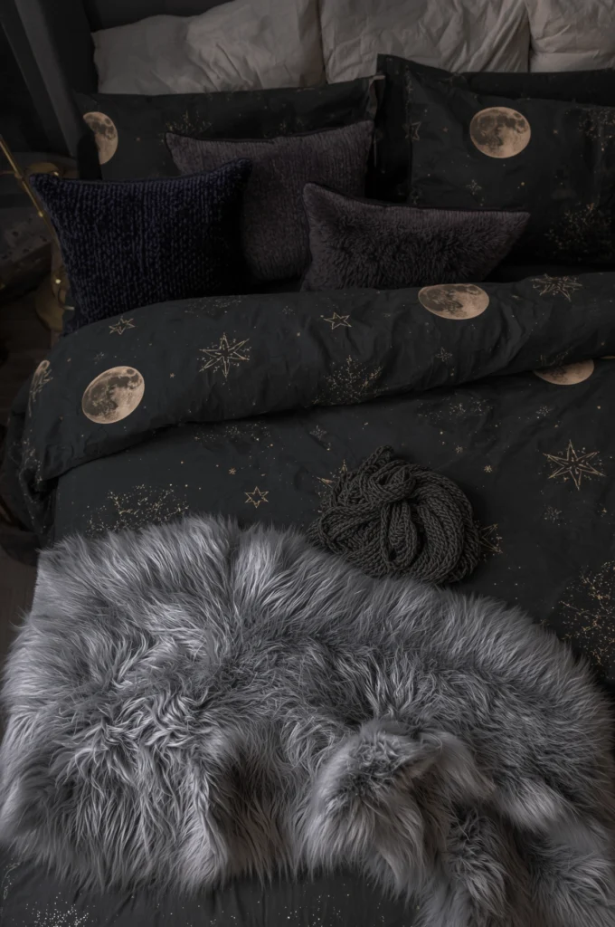 Your bed is the heart of your witchy bedroom, so bedding is a great way to express the theme. Look for duvet covers and pillowcases with moon, star, or botanical prints. Darker tones like black, charcoal, deep green, or burgundy work best to set the mood. Layer bedding with textured throws such as chunky knits, velvet blankets, or faux fur. This adds depth and coziness while keeping the witchy vibe. You can mix solid sheets with patterned covers to balance the look. Avoid overly busy designs, as they can clash with other decor in the room. Adding accent pillows with embroidery or occult symbols is another easy touch. Bedding can be swapped seasonally to keep the room fresh. Invest in high-quality fabrics like cotton or linen for comfort and durability. Witchy bedding sets bring your theme together while making your bed the most inviting feature in the room.