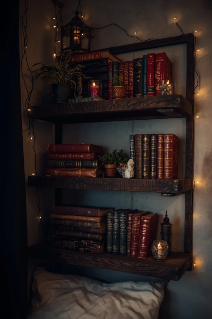 Floating shelves are practical and decorative in a witchy bedroom. They let you display spell books, grimoires, or vintage novels without taking up floor space. Arrange books upright or stack them horizontally for variety. Pair them with small decor items like candles, jars, or potted plants to create balance. Adding crystals or statues to the shelves enhances the mystical effect. Organize your books by size, color, or theme depending on the look you want. For a gothic aesthetic, choose dark wood shelves with iron brackets. Minimalist floating shelves in black or white can give a modern witchy style. Keep your most meaningful or well-used books within easy reach. Floating shelves also allow you to refresh displays easily when you want a new look. This idea combines storage with style, keeping your bedroom tidy while reinforcing the witchy theme.