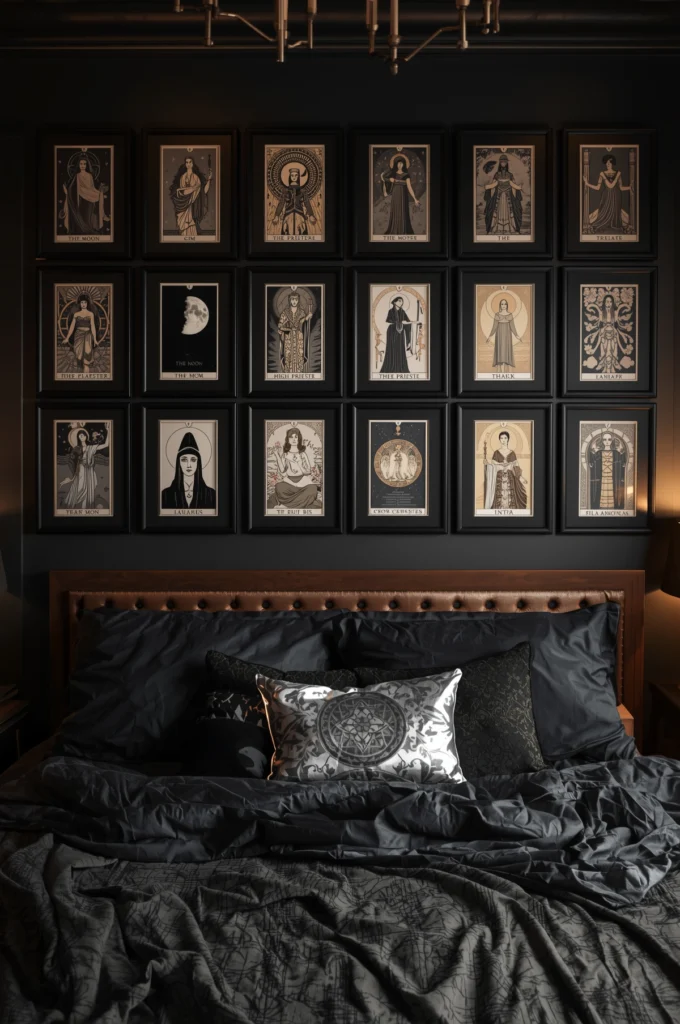 Tarot cards are both meaningful and beautiful, making them perfect wall art for a witchy bedroom. You can frame your favorite cards and display them as a gallery wall. Choose cards with personal symbolism, such as The Moon, The High Priestess, or The Star. Larger tarot prints are also available and can serve as focal pieces above the bed or desk. For a cohesive look, use matching frames in black, silver, or gold. Arrange cards in symmetrical grids for order or in organic clusters for a casual vibe. Tarot art doesn’t just look good, it also serves as inspiration for self-reflection. If you practice tarot, keeping cards on display can remind you of your spiritual goals. You can switch cards seasonally or when working with specific energies. Tarot card wall art adds a personal, mystical layer to your bedroom decor.