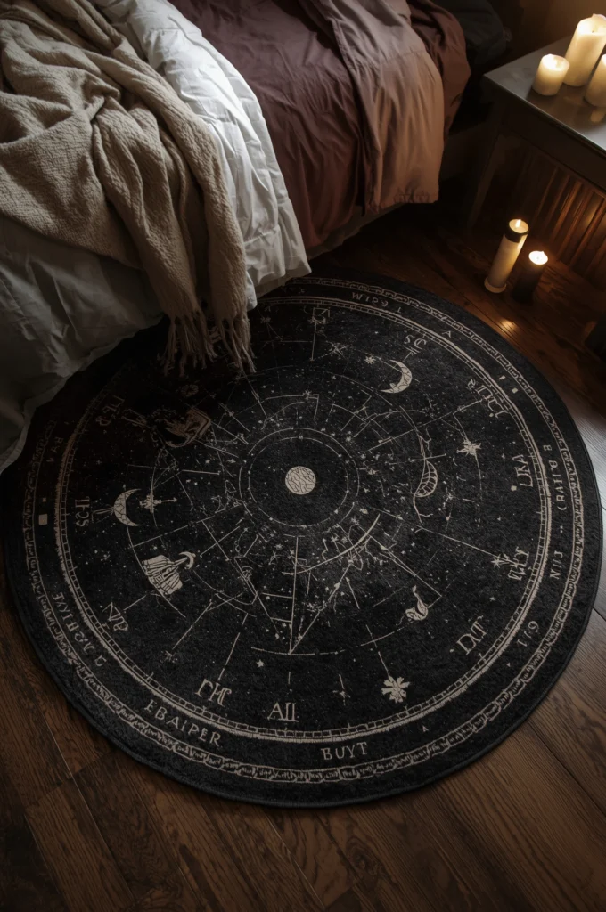 A rug grounds the energy of a bedroom, and in witchy decor it also ties the theme together. Choose rugs with celestial or occult-inspired designs, such as star maps, mandalas, or crescent moons. Round rugs look especially good under the bed or in reading corners. Dark colors like black, navy, or burgundy highlight the mystical feel, while muted neutrals offer a softer look. Plush textures create warmth and comfort underfoot. A rug also helps define spaces within your room, such as an altar corner or seating area. If you want a DIY project, stenciling moon or rune designs onto a plain rug can give it a custom look. Rugs also absorb sound, making the bedroom more peaceful. This detail may seem small, but it adds depth and cohesion to your witchy bedroom design.