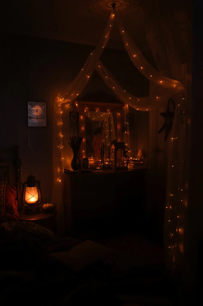Lighting changes the entire feel of a witchy bedroom. Harsh white lights don’t work for this theme, so focus on warm, ambient options. Salt lamps emit a soft orange glow that feels grounding and calming. Lantern-style lamps or wrought-iron sconces add gothic detail. String lights draped around the canopy, shelves, or mirror create a whimsical look. You can also place LED candles around the room for a safe alternative to real flames. Positioning lights behind sheer fabric diffuses them, giving the room a magical glow. Mix different lighting sources at various heights for depth. Avoid overhead lights, as they flatten the mood. Instead, layer smaller lamps to create a cozy, enchanting vibe. Ambient lighting makes your witchy bedroom more inviting and enhances every other decor detail.