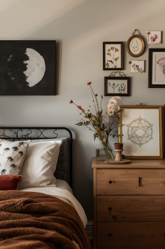 The most powerful witchy bedrooms include personal touches. DIY projects let you put your own energy into the space. Paint moon phase art on canvas and hang it on the wall. Frame pressed flowers or herbs to display as botanical witchy art. Craft sigils on wood panels or embroider them onto pillows. Even small handmade items like rune stones or painted jars add character. Making decor yourself also ensures that no other bedroom looks exactly like yours. You can change DIY projects seasonally to reflect cycles and moods. Involving your creativity connects you more deeply to the space. DIY doesn’t have to be expensive; many projects can be made with simple materials at home. Personal projects make your witchy bedroom not just stylish, but meaningful.