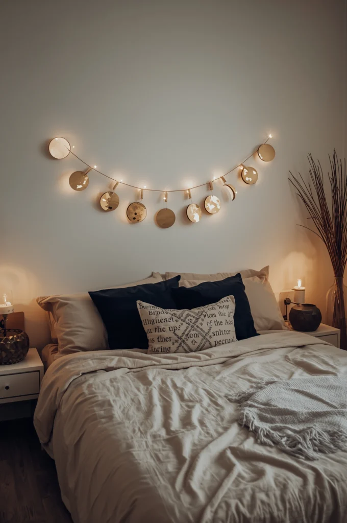 The moon holds deep symbolic value in witchcraft, making moon phase decor a must-have. A garland with wooden or metal moon phases above your bed is a popular choice. You can buy ready-made sets online or create your own with clay, wood slices, or even cardboard painted in silver or black. Moon mirrors are another option, and they look beautiful in clusters on the wall. This decor connects you with lunar cycles and adds a celestial touch to your space. You can use string lights to highlight the garland for nighttime glow. Place moon decor over the bed, near a reading nook, or above your altar. It instantly becomes the focal point of the bedroom. The phases can remind you of cycles of change, growth, and release. This simple detail adds both beauty and meaning to your witchy bedroom.
