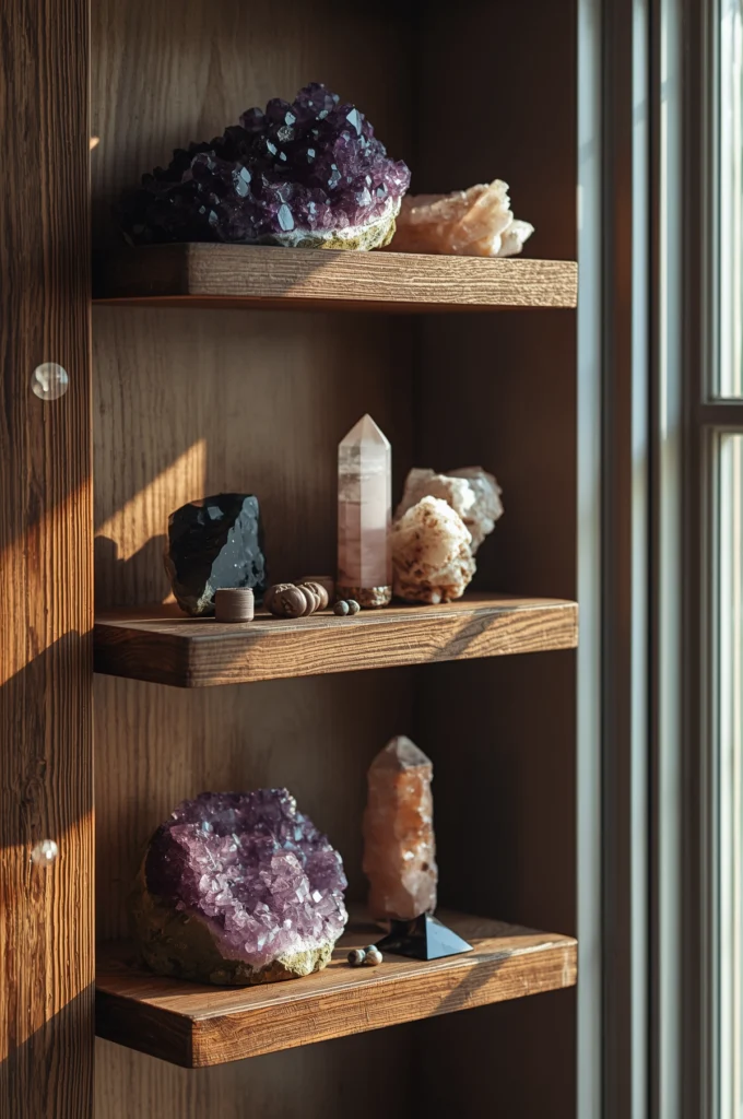 Crystals are essential in witchcraft and serve as both decor and energy tools. A dedicated crystal shelf makes your bedroom feel magical while keeping your stones organized. Use floating shelves, wooden trays, or glass boxes to arrange crystals like amethyst, clear quartz, black tourmaline, and rose quartz. Place them near natural light to highlight their colors and textures. Crystals also work well on nightstands where they add both beauty and energy support. Keep larger stones like geodes or clusters as statement pieces on dressers or side tables. To cleanse crystals, you can rotate them outdoors during full moons or place them on selenite plates. Mixing crystals with candles or small plants enhances their visual effect. A well-displayed crystal collection feels like a living, breathing part of the bedroom. This combination of design and purpose makes your space feel more balanced and intentional.