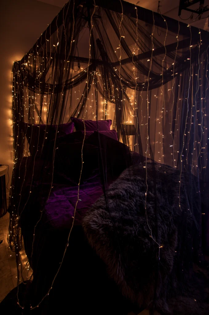 A canopy creates a dreamy centerpiece for a witchy bedroom. Choose sheer black, dark purple, or deep green fabric for the most enchanting effect. The draped fabric softens the space and makes your bed feel sacred and protected. Add fairy lights or string lights to the canopy frame for a glowing, mystical look. If you want a gothic style, go for heavier fabrics like velvet or lace. For a softer vibe, choose flowy, translucent fabric. The canopy also adds privacy and creates a cocoon-like feel. Hanging charms or crystals from the canopy gives it more magical detail. You can find canopy frames that attach to the ceiling or freestanding models. Even small bedrooms benefit from this setup since it instantly defines the bed as the focal point. A witchy bed canopy turns ordinary sleep into a magical nightly ritual.