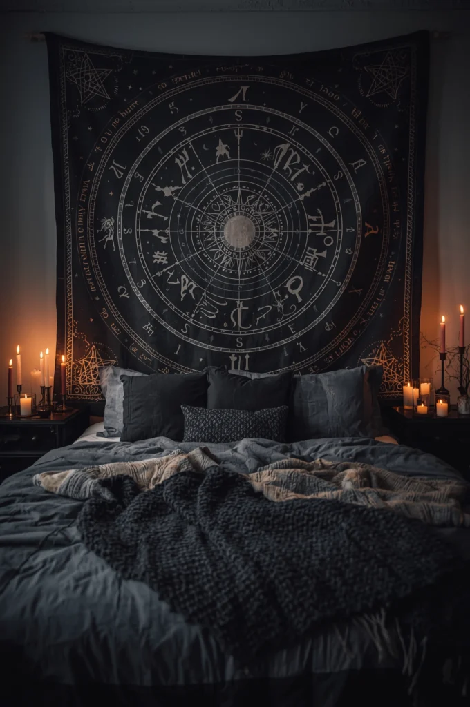 Tapestries are affordable and powerful decor pieces. They cover large wall areas and bring character to a witchy bedroom. Choose designs with celestial patterns, runes, tarot symbols, or astrology charts. These motifs tie the magical theme together and act as spiritual reminders. Large tapestries look perfect above the bed or behind an altar. Muted colors such as black, burgundy, or beige work best for a mature look. Avoid overly bright shades, which can clash with the cozy, mysterious mood. Tapestries also add texture, making your bedroom feel layered and warm. You can swap them seasonally to refresh the space. For a DIY approach, paint your own symbols on plain fabric. Framed textile art can also serve as a smaller alternative. Tapestries instantly elevate the theme of your bedroom without requiring expensive renovations. They remain one of the easiest and most effective witchy decor solutions.